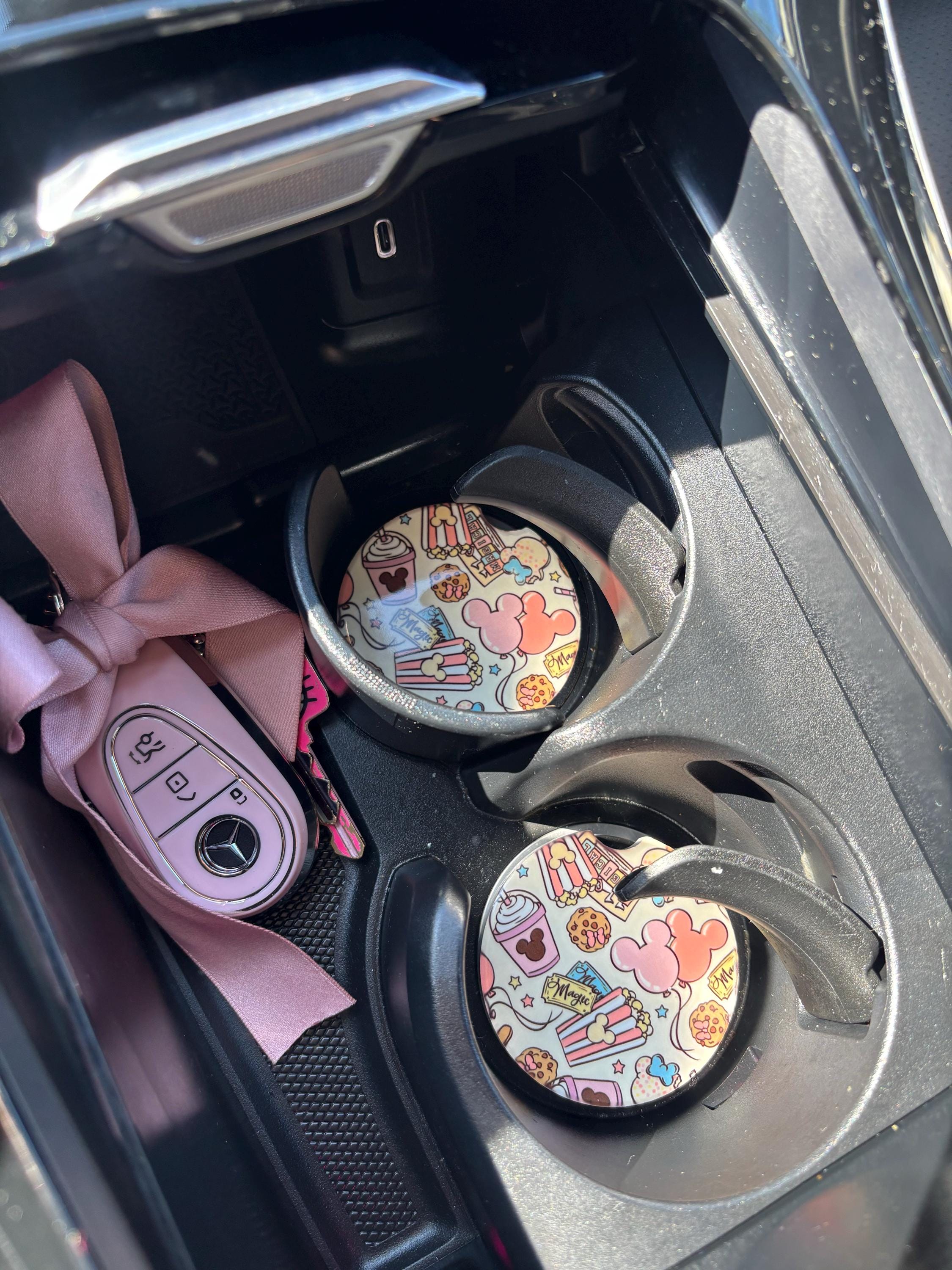 Add a touch of Disney magic to your car with this adorable set of 2 ceramic car coasters, featuring a fun Disney snacks theme! These coasters showcase all your favorite park treats, including Mickey-shaped ice cream bars, popcorn, and churros, bringing the joy of Disney right into your vehicle.