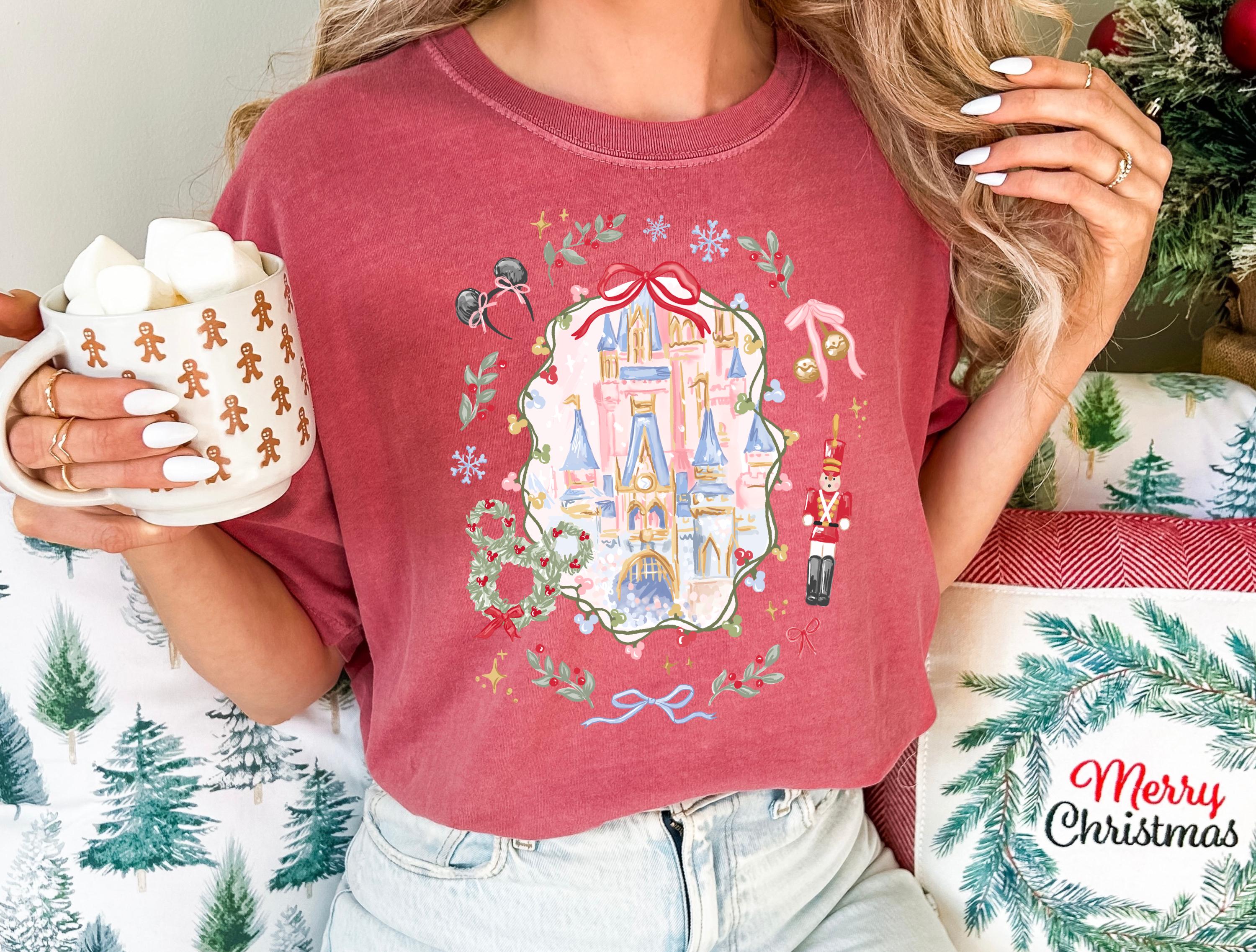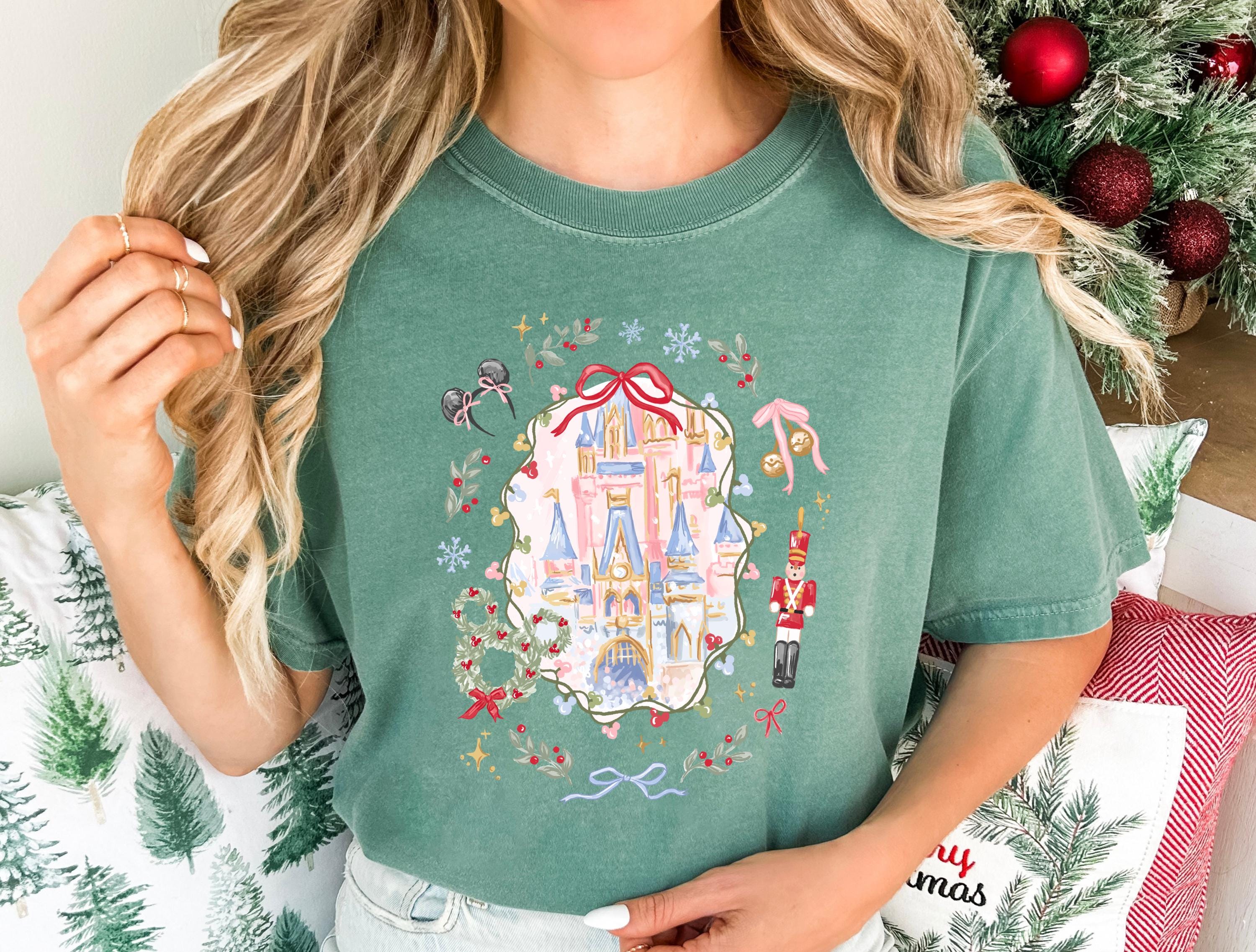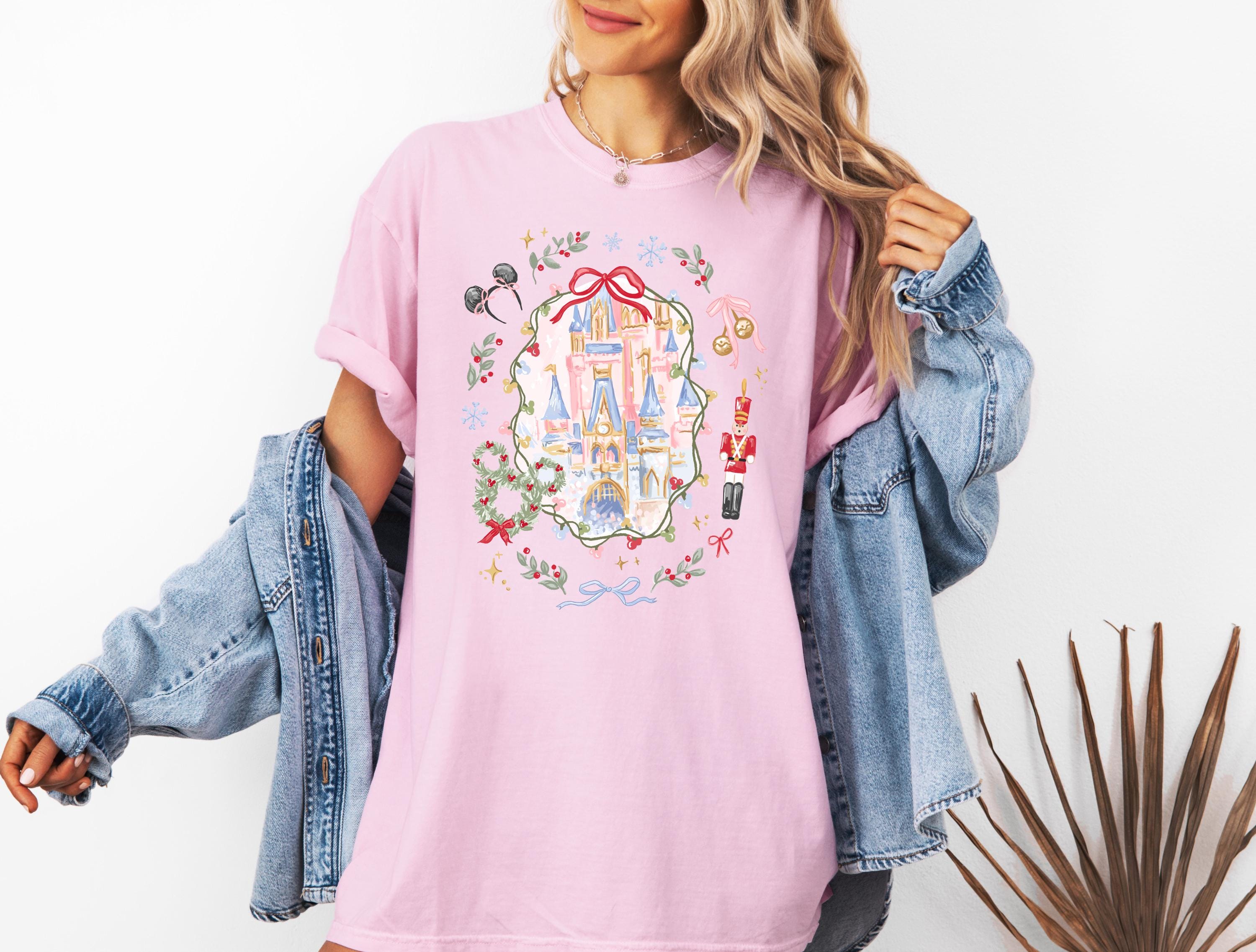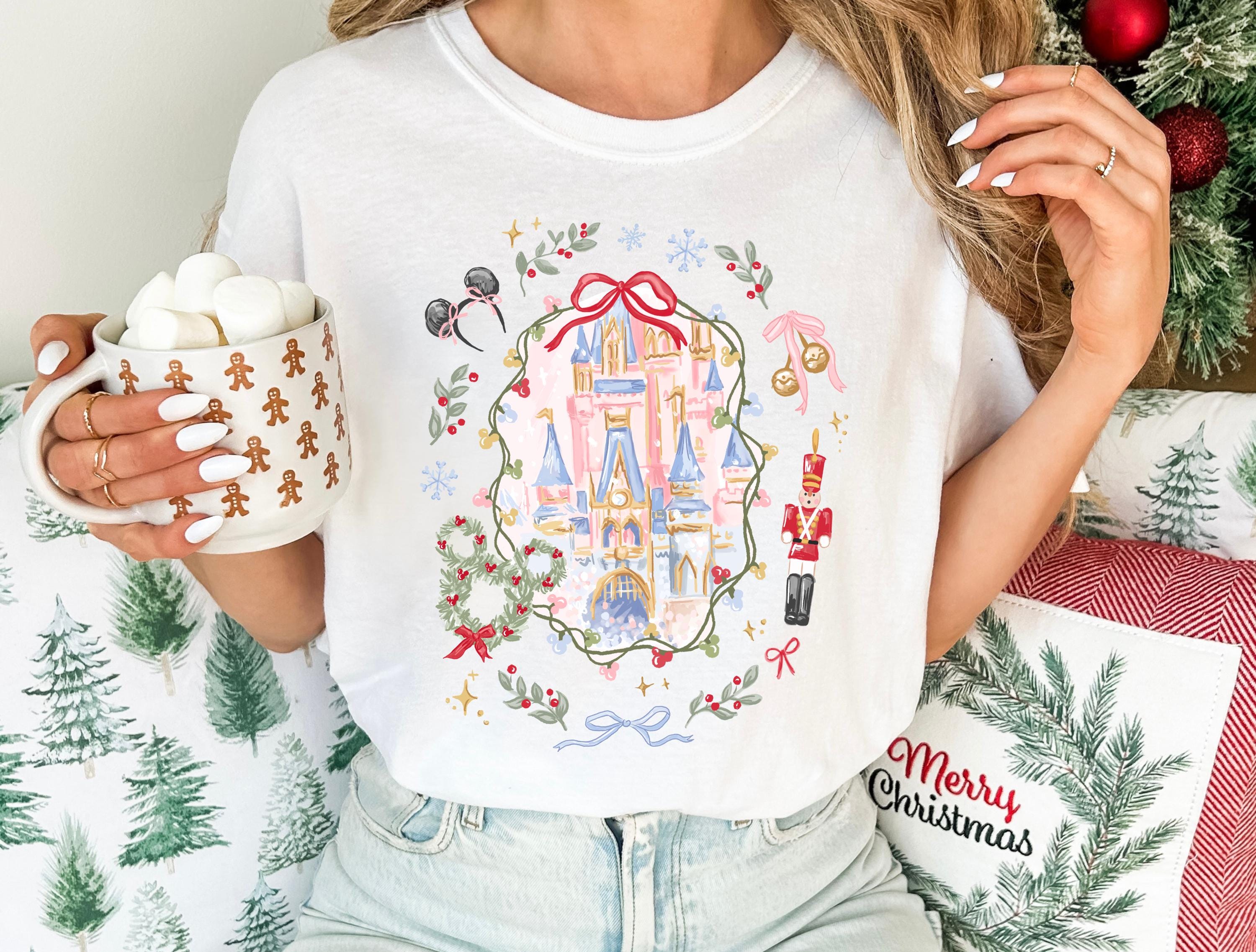 Bring the magic of the holidays home with this cozy Disney-inspired Christmas sweatshirt! Featuring a beautifully detailed pastel castle wrapped in festive wreaths, nutcrackers, bows, and ornaments, this design is perfect for every Disney fan who loves celebrating the season in style.