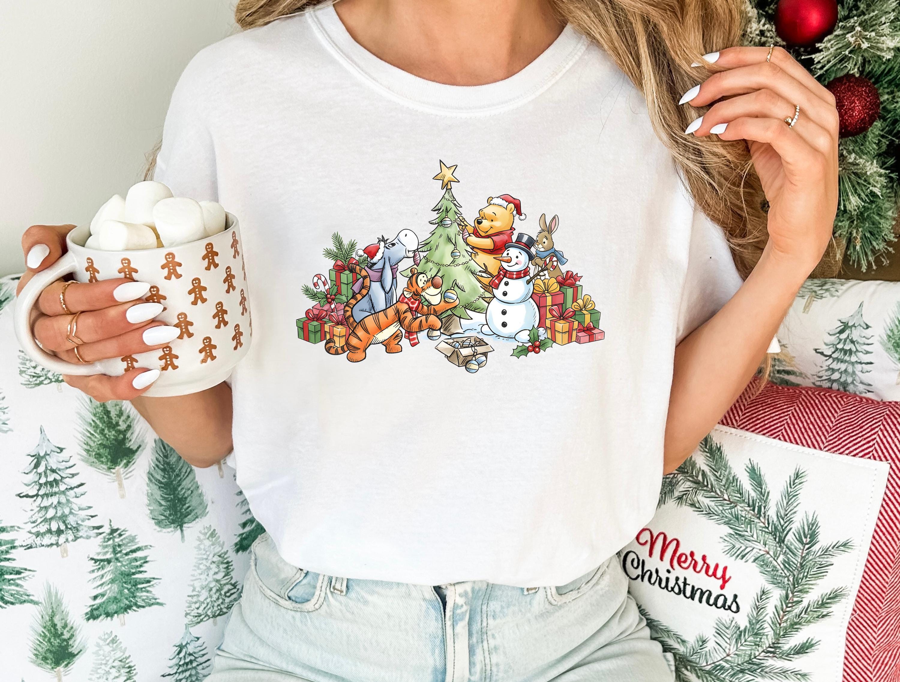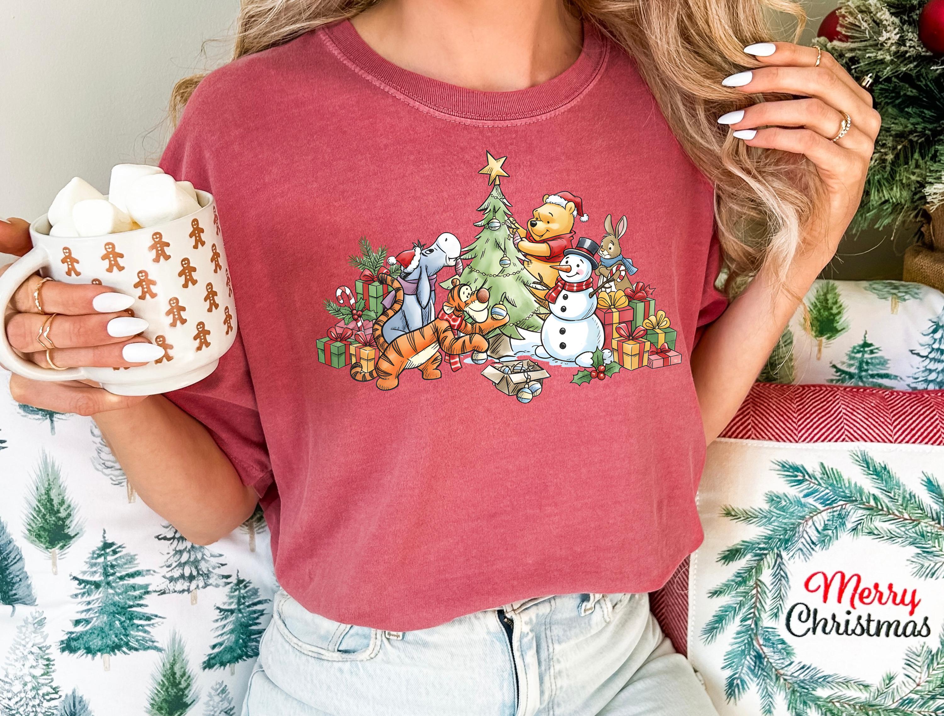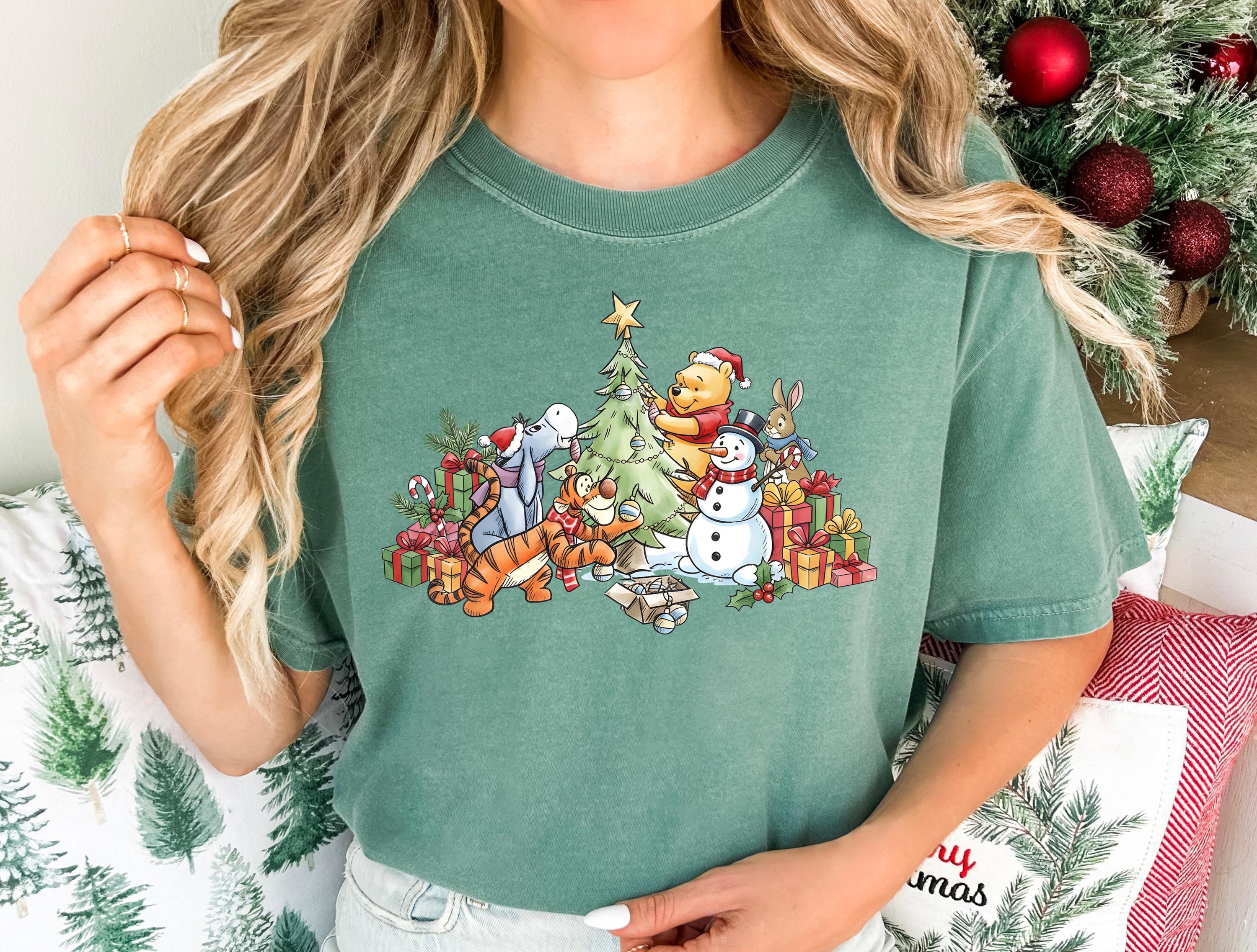 Bring a touch of holiday cheer and Disney magic to your wardrobe with this Christmas Pooh and Friends Comfort Colors shirt! Featuring Winnie the Pooh, Tigger, Eeyore, and Piglet gathered around a festive Christmas tree with gifts, ornaments, and a jolly snowman, this soft and cozy tee is perfect for celebrating the season in style.