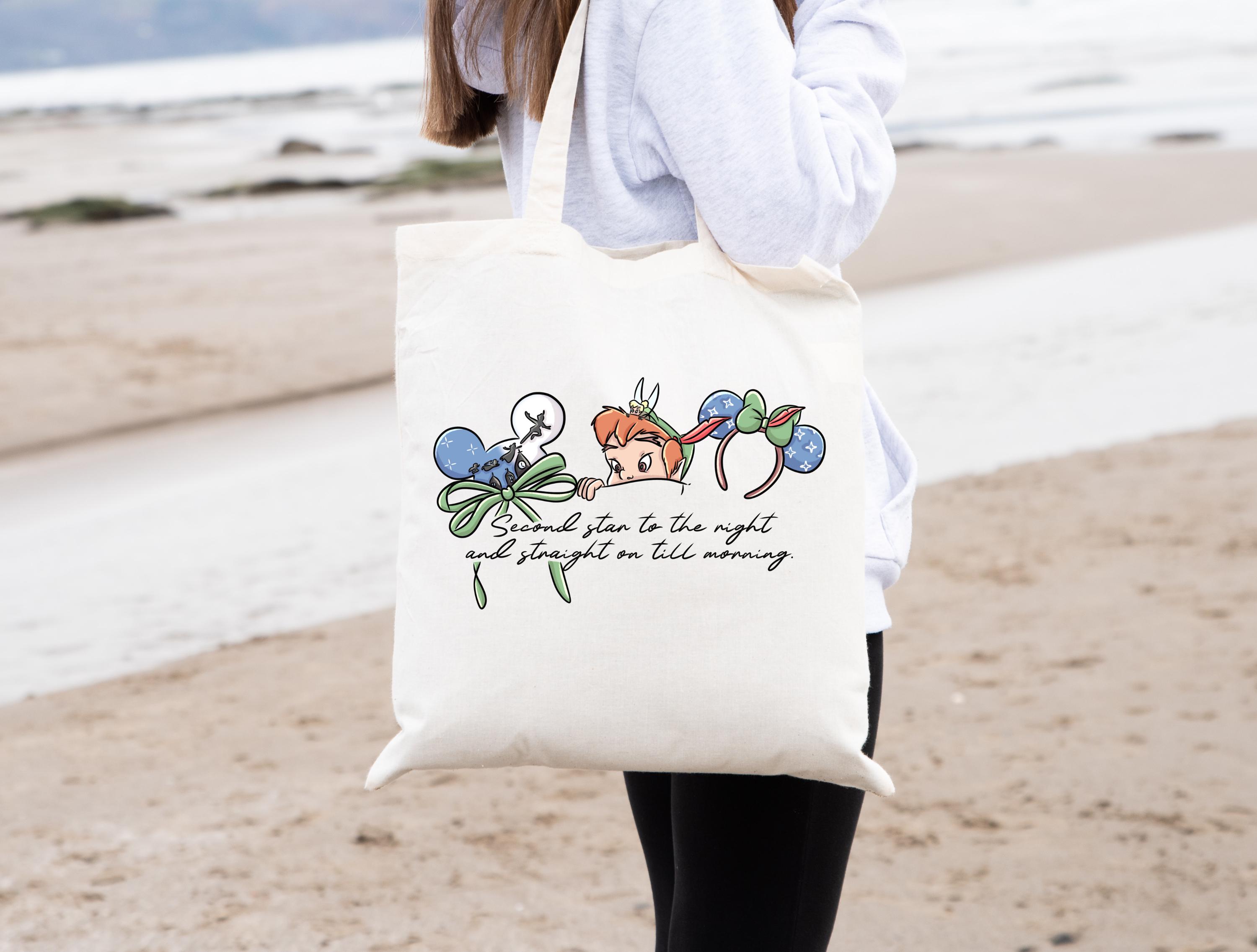 Bring a touch of Neverland wherever you go with this Disney-inspired Peter Pan tote bag! Featuring a charming pastel design with Peter Pan, Mickey ears, and the magical quote “Second star to the right and straight on till morning,” this tote captures the whimsy and adventure of everyone’s favorite boy who never grew up.