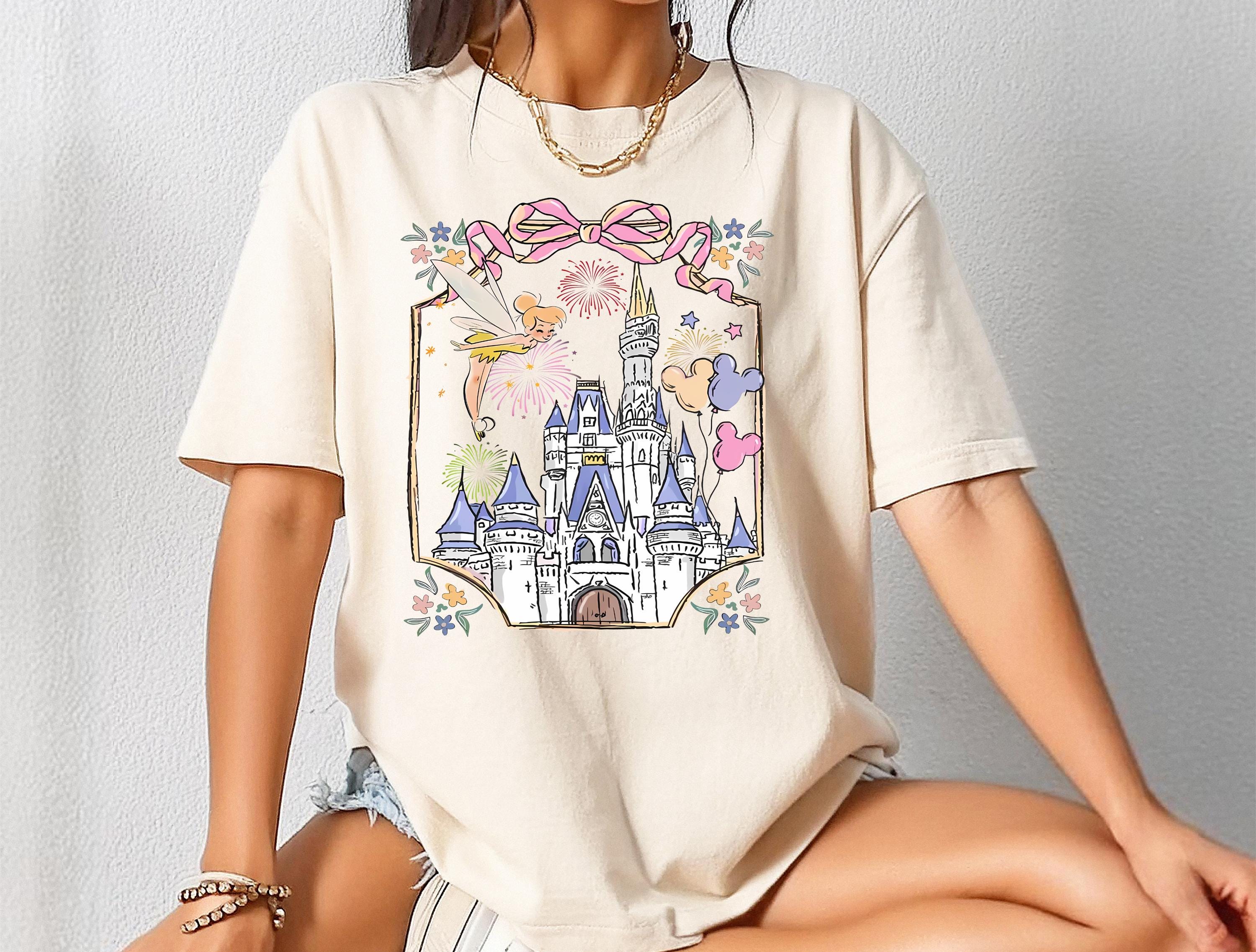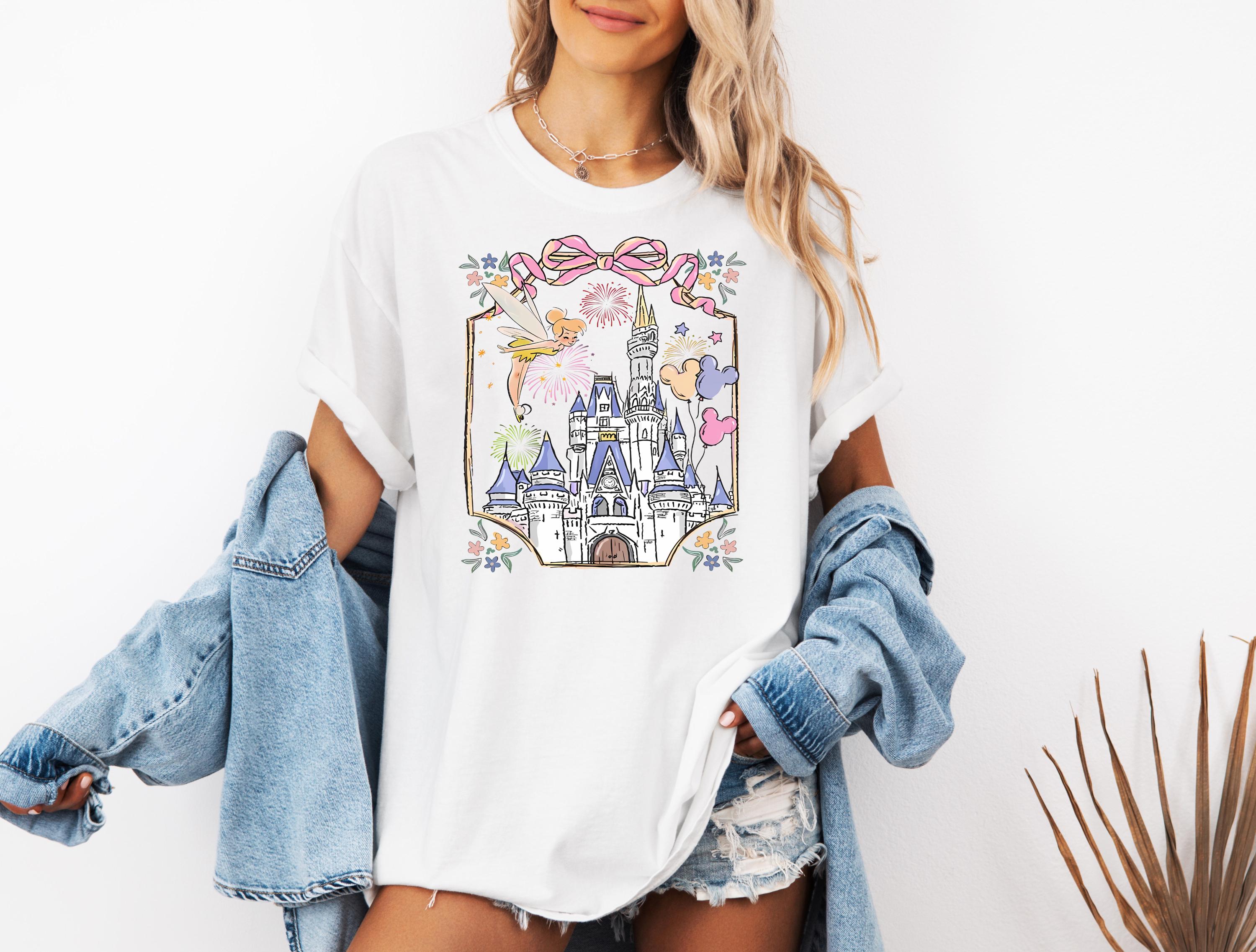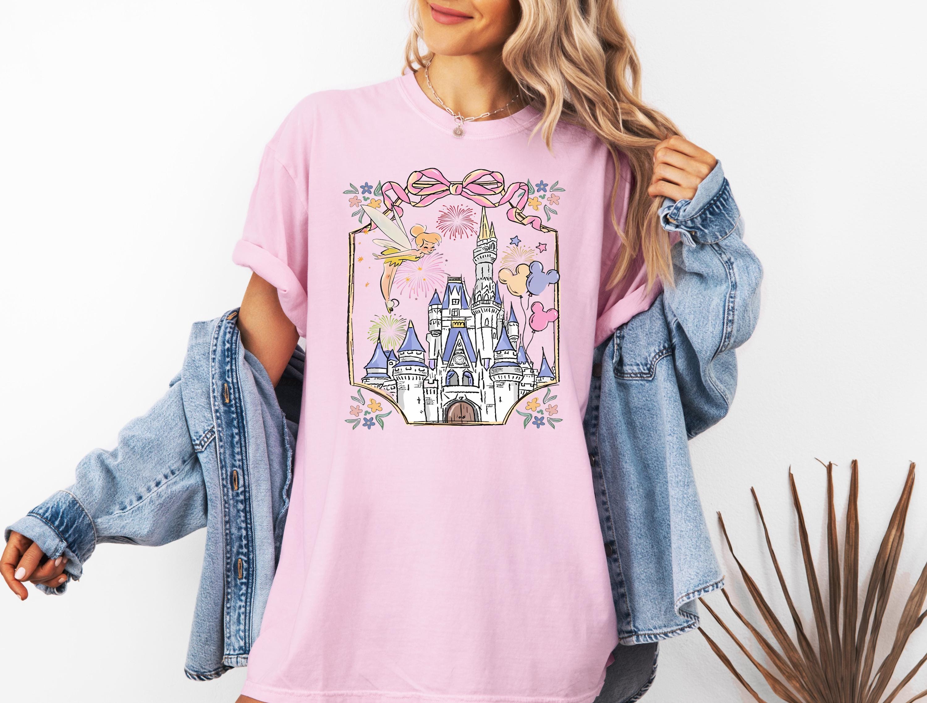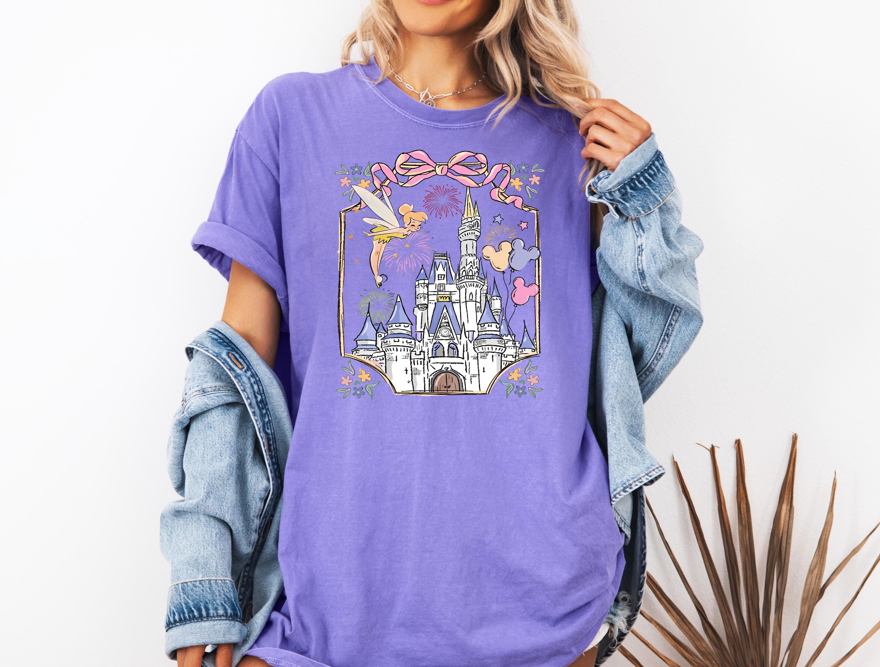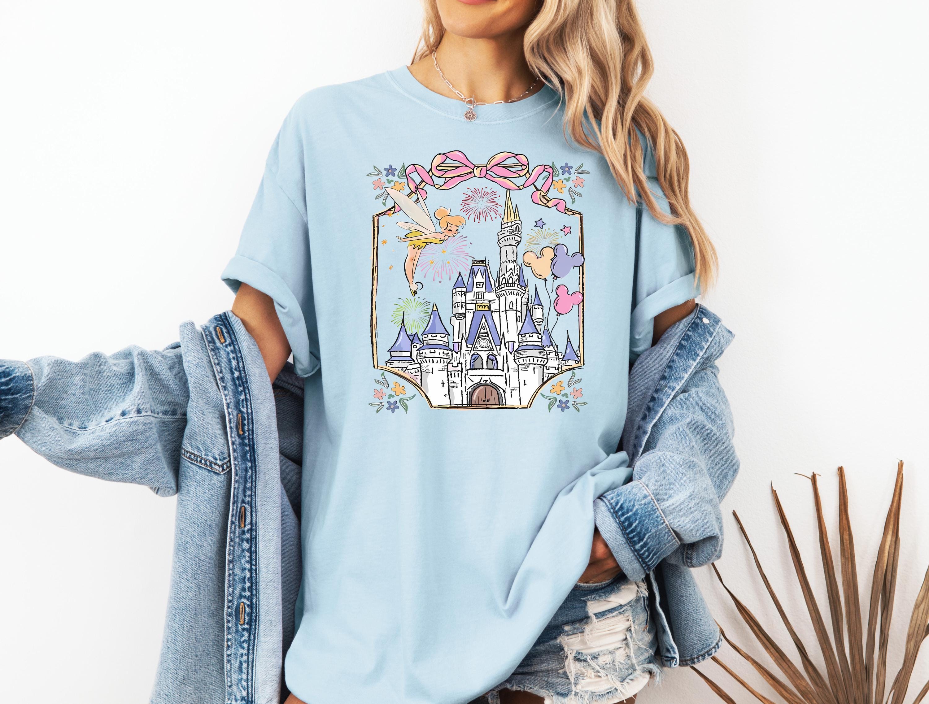 Add a touch of magic to your wardrobe with this Disney-inspired Comfort Colors T-shirt, featuring a dreamy pastel castle design surrounded by fireworks, Mickey balloons, and a sprinkle of pixie dust! This enchanting tee is perfect for park days, cozy weekends, or simply showing your love for all things Disney.